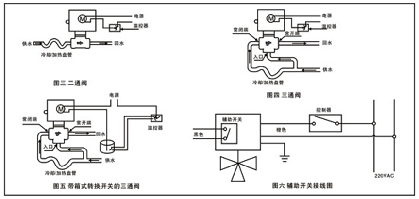 常閉二通閥和混合三通閥的安裝如圖形3、4所示。對(duì)于高層建筑物,應(yīng)在底層支管上采用減壓閥。安裝閥體時(shí),應(yīng)注意閥體的箭頭指向,若帶有輔助開(kāi)關(guān),其接線如圖6所示。